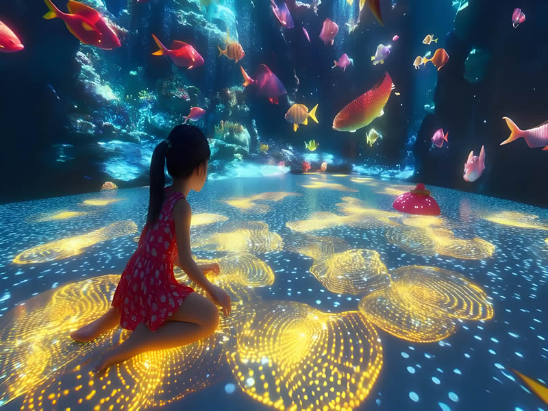 推開任何一扇門,你可能都會遇見這樣神奇的景象——當你對著空蕩蕩的墻面輕輕揮手,突然有無數發光的花瓣從指尖綻放;在教室里,那些枯燥的數學公式突然變得"聽話"起來,隨著你的手勢在空中旋轉跳躍;走在戶外廣場上,每一步都會"驚動"腳下的光影魚群,它們四散游開又變成盛開的蓮花……這不是科幻電影里的場景,而是一種名為"想象投影"的黑科技正在我們的生活中上演的"光影魔術"。